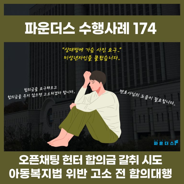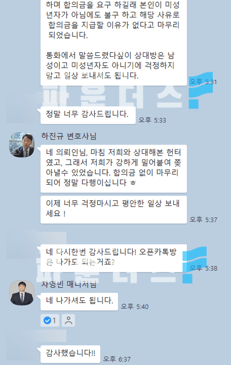 지정한 날짜에 합의금 입금이 되지 않으면 고소를 진행하겠다는 B 씨의 말에 걱정이 되었던 의뢰인은 변호인의 조력을 요청하게 되었다 하였습니다.