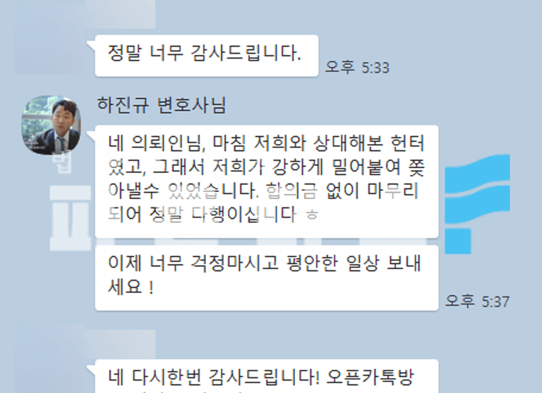 이에 B 씨는 바로 저희 파운더스를 인식한 후 바로 도망을 가, 더 이상 연락을 해오지 않았고 의뢰인에 대한 고소 진행에 이르지 않아 고소 전 사건을 마무리 지을 수 있었습니다.