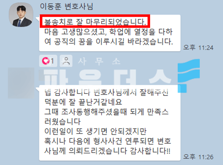 의뢰인은 공무원 준비생이었던 것으로 전과가 남게 된다면 문제가 발생할 가능성이 높은 상황이었기에 빠른 대응이 필요하였고 결과적으로 경찰 단계에서 무혐의로 마무리 지을 수 있었습니다.