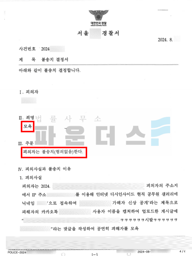 그 결과 의뢰인은 온라인 커뮤니티에서 공무원 자살 사건의 악성 민원인을 향해 욕설을 한 것에 대한 모욕 혐의에 대하여 불송치 결정(혐의없음)으로 경찰단계에서 사건을 종결 지을 수 있었습니다.