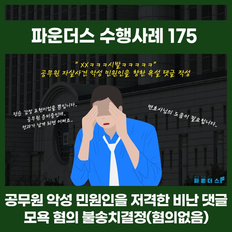 ![[모욕 불송치] 공무원 악성 민원인에 대한 비난 댓글 작성](/_next/image?url=https%3A%2F%2Fd2ai3ajp99ywjy.cloudfront.net%2Fuploads%2Ftitleimage%2Foriginal%2F5b7519494b39577da0a5626e-original.jpg&w=3840&q=75)