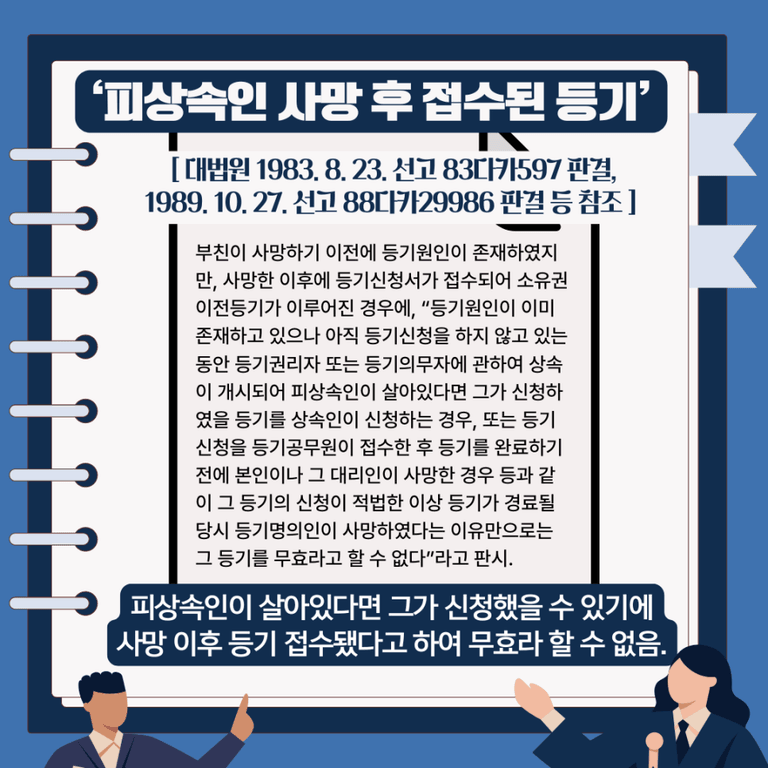 이에 대하여 재판부에서는 부친이 사망하기 이전에 등기원인이 존재하였지만, 사망한 이후에 등기신청서가 접수되어 소유권이전등기가 이루어진 경우에, “등기원인이 이미 존재하고 있으나 아직 등기신청을 하지 않고 있는 동안 등기권리자 또는 등기의무자에 관하여 상속이 개시되어 피상속인이 살아있다면 그가 신청하였을 등기를 상속인이 신청하는 경우, 또는 등기신청을 등기공무원이 접수한 후 등기를 완료하기 전에 본인이나 그 대리인이 사망한 경우 등과 같이 그 등기의 신청이 적법한 이상 등기가 경료될 당시 등기명의인이 사망하였다는 이유만으로는 그 등기를 무효라고 할 수 없다”(대법원 1983. 8. 23. 선고 83다카597 판결, 1989. 10. 27. 선고 88다카29986 판결 등 참조)라고 판시한 위 대법원 판례를 인용하여 유효한 등기로 인정하였습니다.
