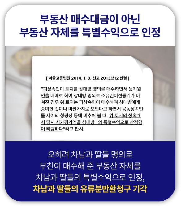 위 사안에서 딸들 명의로 부친이 매수하여 준 각 부동산의 경우에는 모든 매수대금을 부친이 부담한 것으로 인정하여 차남과 딸들의 특별수익으로 인정하였고, 이러한 근거로 차남과 딸들의 유류분반환청구가 기각된 사안입니다.