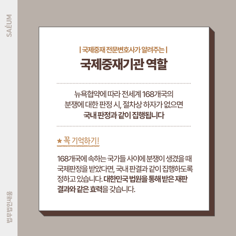하지만 이러한 판단은 큰 잘못이었습니다. 3개월 정도 시간이 흘러 A 기업에 소장이 날아온 것입니다. 중앙지방법원은 외국 중재 판정에 근거하여 강제집행을 한다고 알렸습니다. 외국중재판단의 승인과 집행에 관한 협약을 의미하는 뉴욕협약에 따라 전 세계 168개국들의 분쟁에 대한 판정이 나왔을 때 절차상의 하자가 없으면 국내 판정과 같이 집행해야 한다는 내용 때문이었습니다.