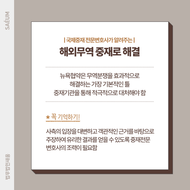 이처럼 뉴욕협약은 무역분쟁을 효과적으로 해결하는 가장 기초적인 틀입니다. 위의 사례에서 A 기업이 적극적으로 중재기관을 통해 방어권을 행사하였다면, 다른 결과를 얻었을지 모릅니다.
