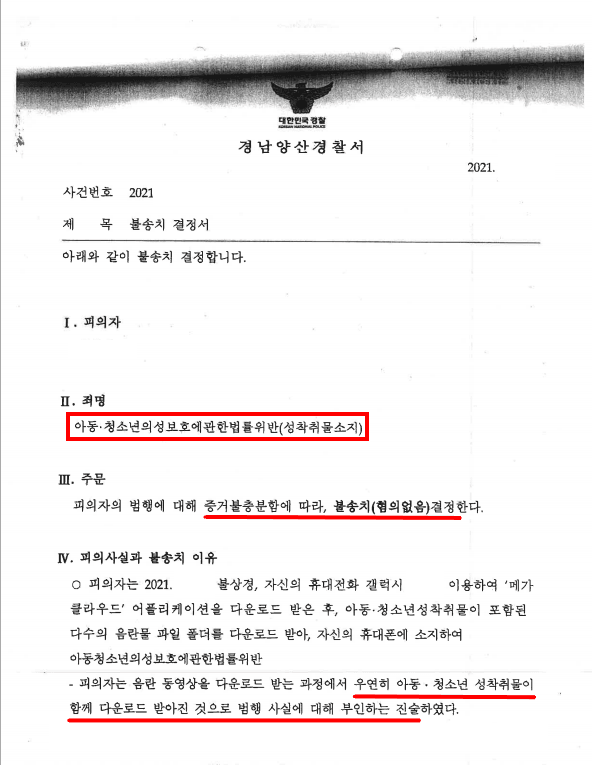 이에 수사기관은 본 변호인의 주장을 모두 받아들여, "피의자가 휴대전화를 이용하여 음란 동영상을 다운로드 받는 과정에서 우연히 아동청소년 성착취물이 함께 다운로드 받아진 것으로 보인다."고 하여 아동성착취물 소지에 대해서는 증거불충분 무혐의 결정을 하였습니다.
