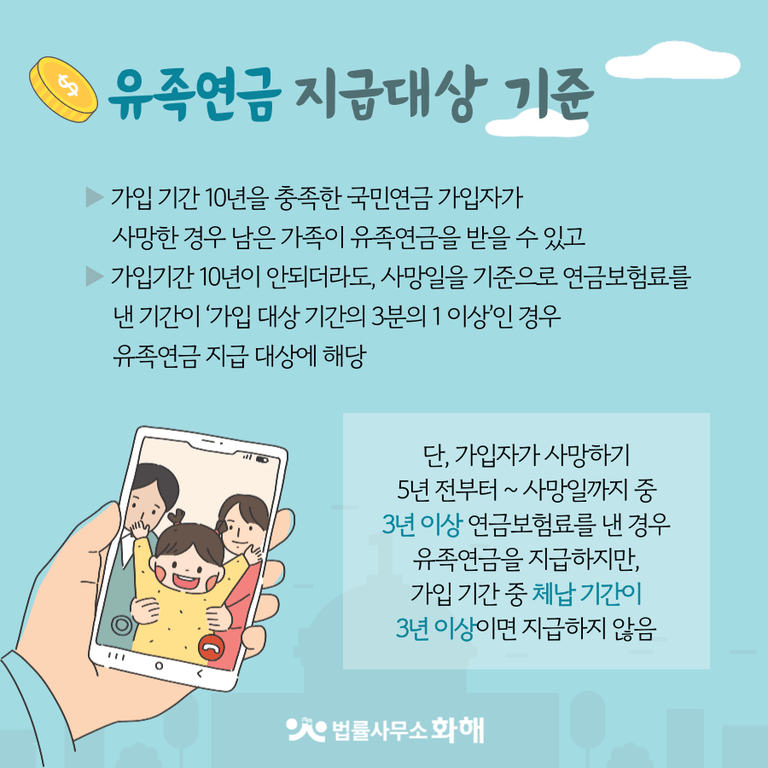 · 가입기간 10년이 안되더라도, 사망일을 기준으로 연금보험료를 낸 기간이 ‘가입 대상 기간의 3분의 1 이상’인 경우 유족연금 지급 대상에 해당됩니다.