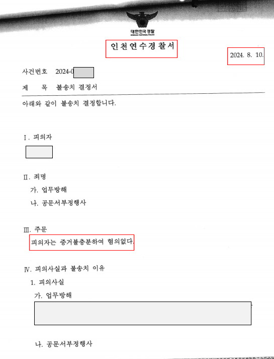 2024. 8. 10. 인천연수경찰서로부터 업무방해, 공문서부정행사죄에 대하여 불송치(혐의없음) 결정을 받아 의뢰인이 억울한 형사고소로부터 벗어날 수 있게 만든 성공사례