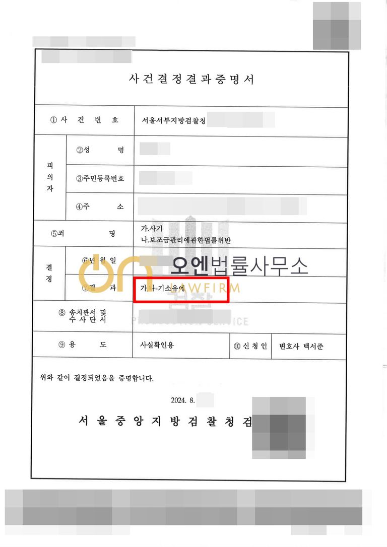 검찰은 변호인의 주장을 받아들여, 의뢰인이 보조금으로 받은 월급을 전혀 반환하지 않았음에도 의뢰인에게 기소유예의 선처를 내려주었습니다.