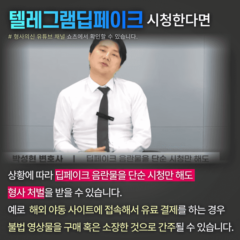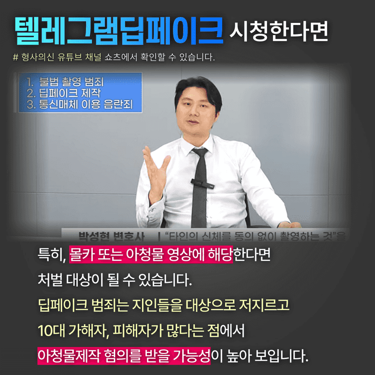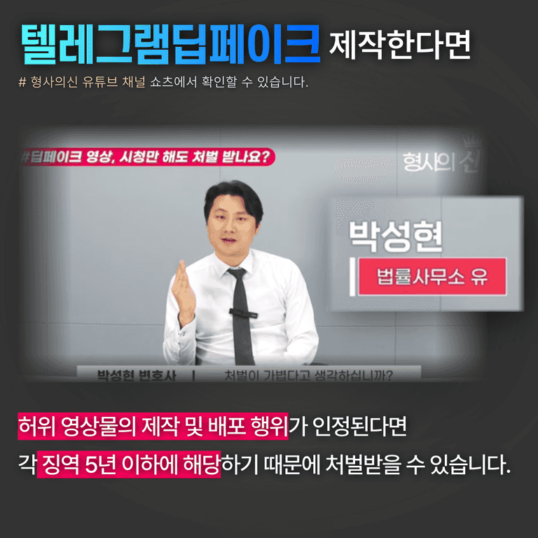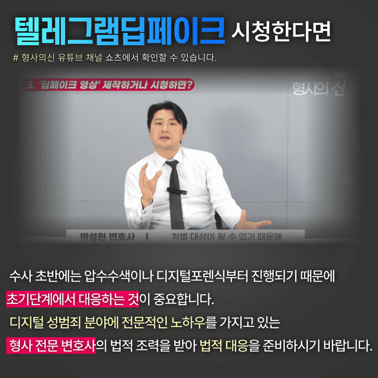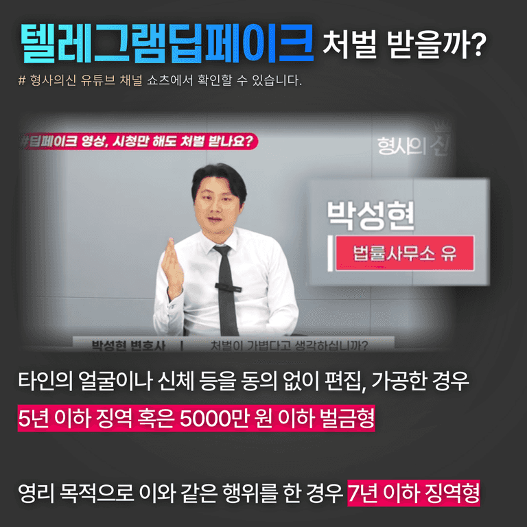 텔레그램딥페이크 처벌 수위, 혐의 등은 아래 내용 혹은 박성현 대표변호사의 유튜브 채널 '형사의신'을 통해 확인해 보시기를 바랍니다.