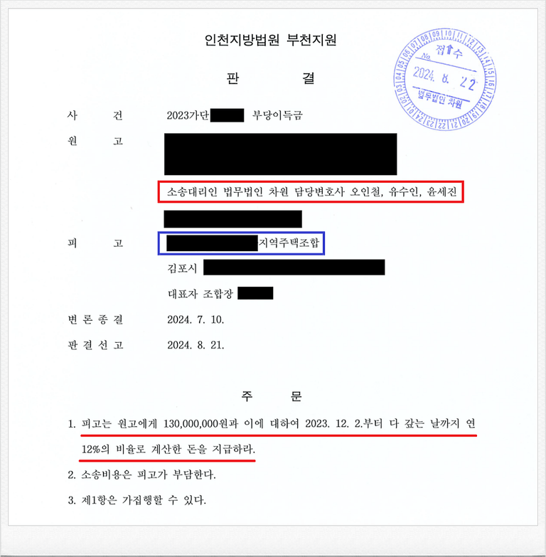 그러나, 가입 후 피고 지역주택조합 측의 사업이 계획대로 진행되지 않았고, 이에 의뢰인은 정식 민사소송을 통하여 기 납입한 금원의 반환을 원하셨습니다.
