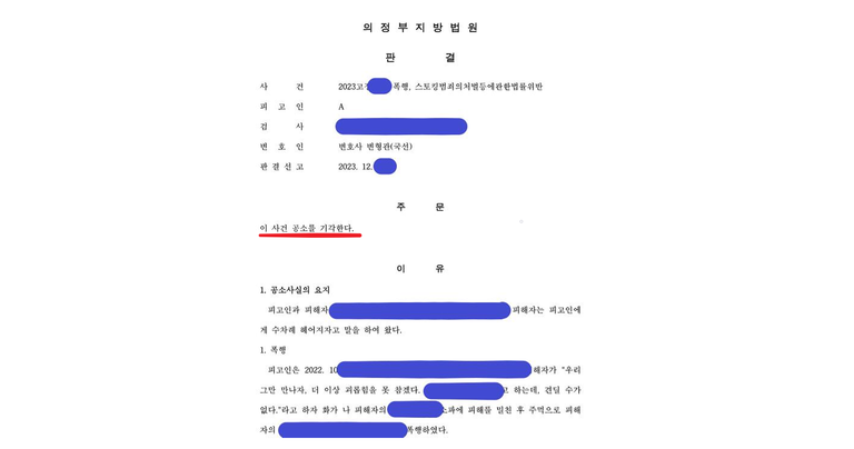 결과는 피해자의 처벌불원의사가 이미 제출된 것으로 인정되어 공소기각의 판결이 선고되었습니다. 전 연인에 대한 범죄 자체에 대한 깊은 반성을 하고 있던 피고인으로서는 반성과 감사의 마음을 함께 느끼게 되었던 사건이었습니다. 물론 그 어떠한 방식으로든 피해자가 원하지 않는 연락이나 접촉은 결코 있어서는 안 된다는 다짐을 거듭 하기도 하였습니다.