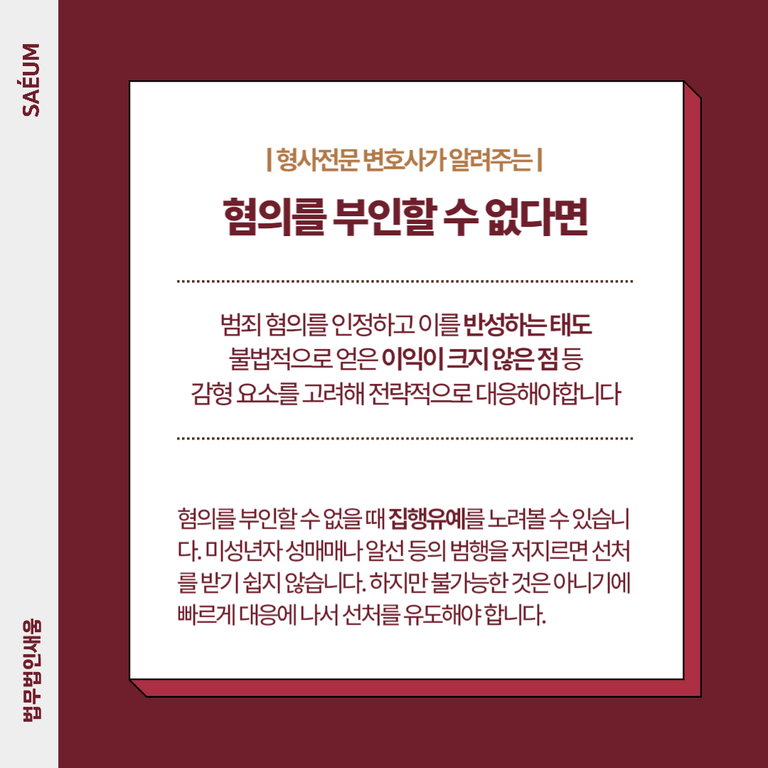 혐의를 부인할 수 없을 때 집행유예를 노려보는 것이 좋습니다. 사실 미성년자 성매매나 알선 등의 범행을 저질렀을 경우 선처를 받기가 쉽지는 않습니다. 하지만 집행유예를 받는 것이 아예 불가능한 것은 아니기 때문에 빠르게 대응에 나서서 선처를 유도해야 하는데요. 우선 반성하는 태도를 보이고 다시는 이와 같은 범행을 저지르지 않을 것임을 어필할 수 있도록 해야 합니다. 이외에도 불법적인 행위로 얻은 이익이 크지 않다거나 혹은 죄질이 크게 나쁘지 않다는 점 등을 강조해 볼 수 있으며, 초범이라거나 신체 정신적인 문제, 나이 등 고려가 될 수 있을 만한 요소들을 다양하게 마련한다면 집행유예를 이끌어내 볼 수 있습니다.
