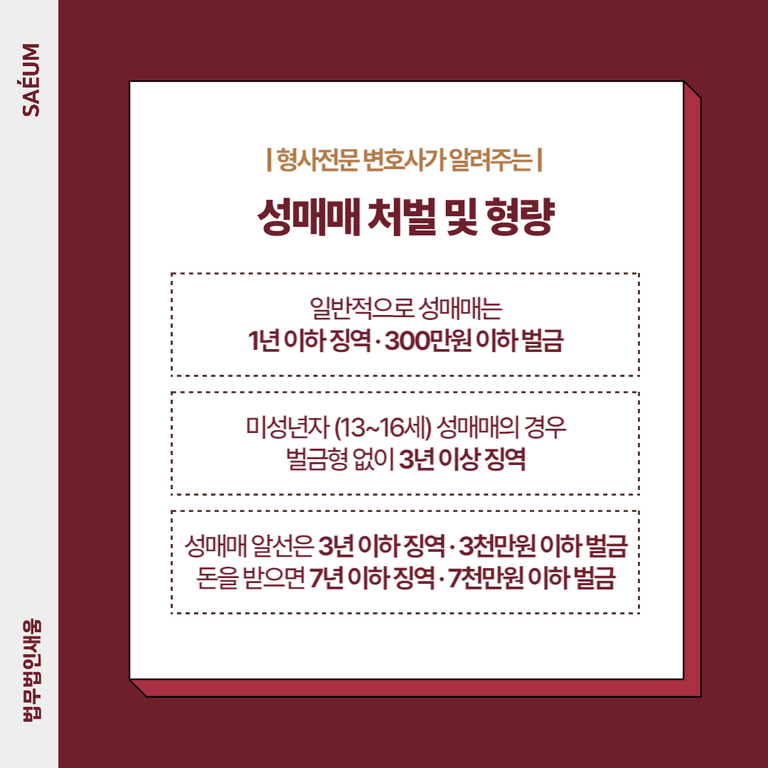 사실 성을 사고파는 행위를 한 당사자들의 경우 처벌이 무겁지 않으며 선처를 받을 가능성도 큰 편입니다. 하지만 미성년자 성매매에 얽히거나 성매매 알선으로 연루가 되는 경우 가벼운 처벌로 끝나기 어려우며 죄질이 가벼운 편이 아니라면 실형 선고의 가능성이 커지게 됩니다. 이런 경우 빠르게 형사전문변호사를 선임하여 대응하는 것이 좋은데요. 형사전문변호사를 초기에 선임하는 경우 조사 과정에서 동행하여 실언하거나 불리한 언행을 하는 것을 막아줄 수 있으며, 상황을 유연하게 이끌어나가 재판에 긍정적인 영향을 줄 수 있게 됩니다. 또한 빠르게 선임을 하게 되면 사건에 대해서 분석하고 대응 방안을 마련할 충분한 시간을 벌어줄 수 있으므로 보다 안정적인 환경에서 사건에 대비해 볼 수 있게 됩니다.
