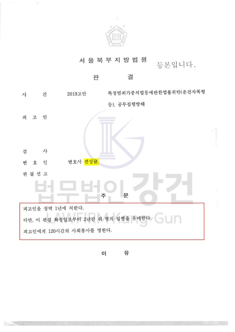 이에 재판부는 법무법인 강건의 주장을 받아들여 운전자 폭행, 공무집행방해죄 혐의에 대해