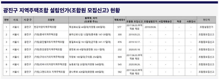 좀 더 쉬운 예시로 서울시 광진구의 경우를 예를들어 보겠습니다. 서울의 동쪽에서 한강을 끼고있는 입지면서 강남3구와도 가까워 주거지역으로 선호되고 있는 광진구에는 한강자양지역주택조합, 중곡지역주택조합, 광진벨라듀지역주택조합, 한강광장지역주택조합, 구의사거리 지역주택조합, 리버시티자양 지역주택조합, 그랜드파크 지역주택조합 등 총 7개의 지역주택조합이 설립되어 사업을 진행 중에 있습니다.