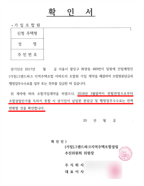 또한 조합설립인가 조차 받지 못한 나머지 조합들 중 (가칭)그랜드파크 지역주택조합을 예시로 살펴보면, 해당 조합 또한 '확인서'라는 명칭으로 위에 설명드린 안심보장증서 성격의 보증서를 조합원들에게 교부하였습니다. 해당 확인서의 내용에 따르면 2018년 3월말까지 조합설립인가를 득하지 못할 시 분담금 및 행정업무수수료를 전액 반환할 것을 보증하였는데, 실제로는 약속과 달리 조합원들의 탈퇴 및 환불요청을 거부하여 다수의 조합원들께서 저희 법무법인 차원에 소송을 의뢰하신 실정입니다.
