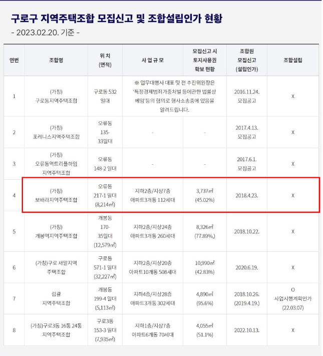 또한 구로구의 경우 앞서 말씀드린 총 8개의 지역주택조합 중 구로동 지역주택조합을 포함한 총 8개가 사업 시작의 첫 단추라 할 수 있는 조합설립인가 조차 받지 못한 체 장기간 표류하고 있습니다. 그 중 7호선 천왕역 역세권과 외곽순환고속도로 등의 편리한 입지와 숲세권 등의 생활인프라를 내세워 조합원들을 모집한 보배라 지역주택조합을 예를 들자면, 2018년부터 조합원들을 모집하기 시작했지만 그로부터 6년이 되었는데도 조합설립인가를 받지 못하고 있어 그동안 많은 조합원들께서 저희 법무법인 차원에 소송을 위임하신 바 있습니다.