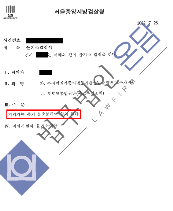 이를 통해 A는 특가법상 도주차량 운전자 혐의를 벗고 불기소 처분을 받았고, 무사히 자동차운전면허를 다시 회복할 수 있었습니다.