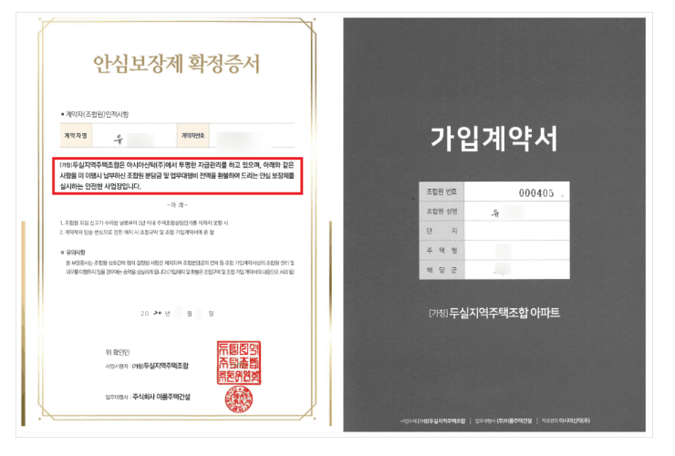 의뢰인 2인(유00, 김00)은 부산광역시 금정구 구서동 일대에서 아파트건설을 추진하는 두실 지역주택조합과 사이에 조합가입계약을 체결하고, 합계 8,181만원 내지 1억 5768만원의 조합원분담금 및 업무대행비를 납부하셨습니다. 그런데 의뢰인들 2인은 조합가입계약 체결 당시, 아래와 같은 내용(분담금 및 업무대행비 전액 환불)의 안심보장제 확정증서를 교부받았는데, 최동욱 변호사는 안심보장증서가 무효에 불과하다는 승소판결들을 전국 각지의 법원에서 이끌어 낸바 있습니다.