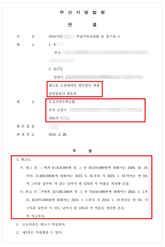 [ 두실 지역주택조합을 상대로 한 전액 승소 판결 ]