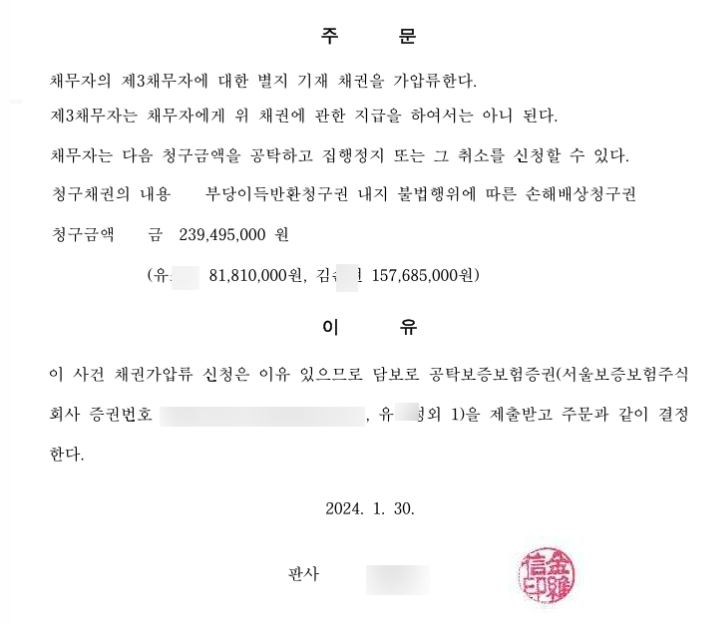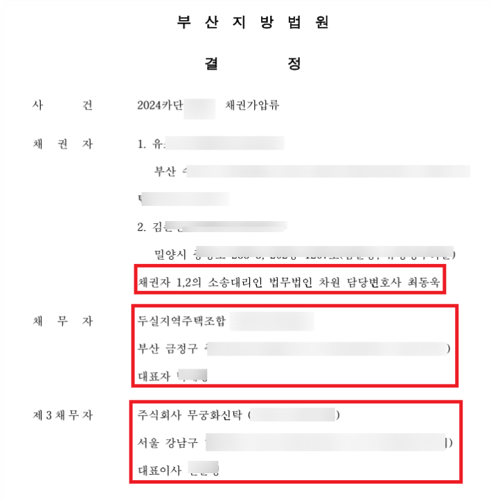 아울러, 최동욱 변호사는 의뢰인들의 실제 피해회복/판결금 회수를 위하여, 소송시작과 동시에, 두실지역주택조합의 자금관리대리사무를 맡고 있는 신탁사(무궁화신탁) 채권가압류를 신청하여 법원의 가압류결정까지 받아 냈습니다. 특히 최동욱 변호사가 전국 수백곳의 지역주택조합들을 상대로 실시한 강제집행의 업무경험, 노하우에 비추어 볼 때, 이 사건 건도 조만간 승소판결에 따른 피해금원 전액을 회수하실 것으로 예상됩니다. 특히 지역주택조합 사건의 경우, 조합을 상대로 판결로 '승소'했다고 해서 피해금액을 곧바로 지급받는 것이 아니라, 이와 같이 조합 및 신탁사를 상대로 강제집행을 실시해서 돈을 뺏어와야만, 피해금원을 실제로 회수하실 수 있습니다.