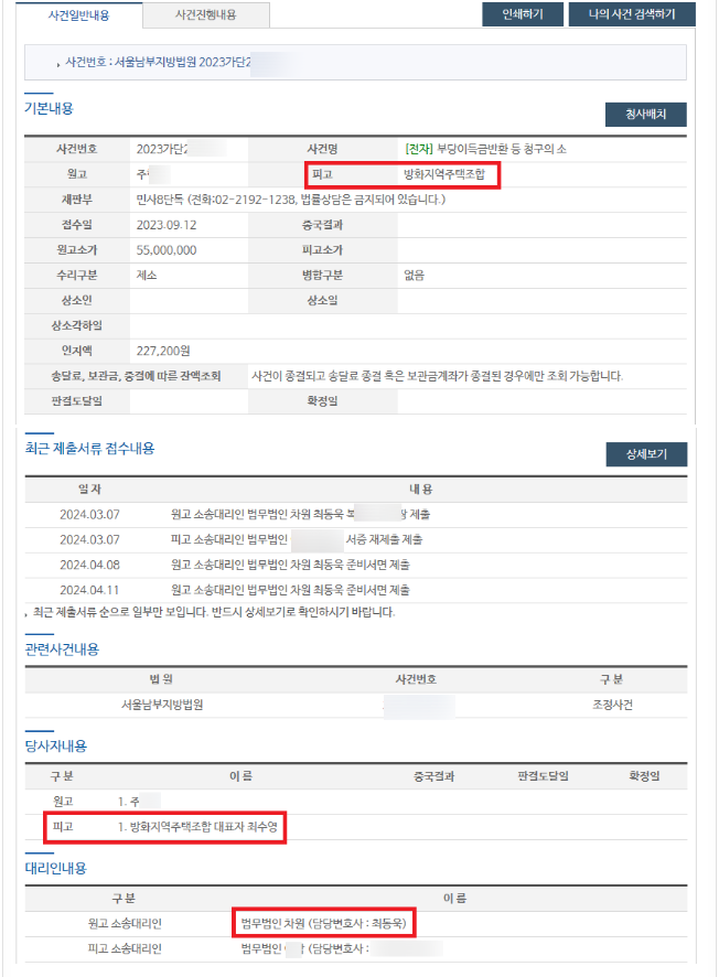 그리고, 최동욱 변호사는 방화지역주택조합을 상대로 민사소송을 제기하면서, 그와 동시에 의뢰인(주00)의 실제 피해금액 회수를