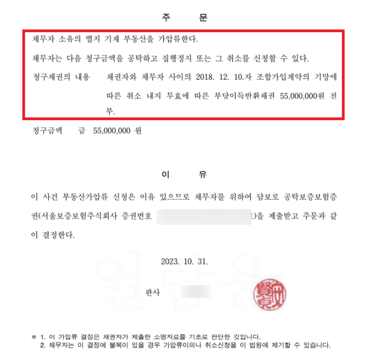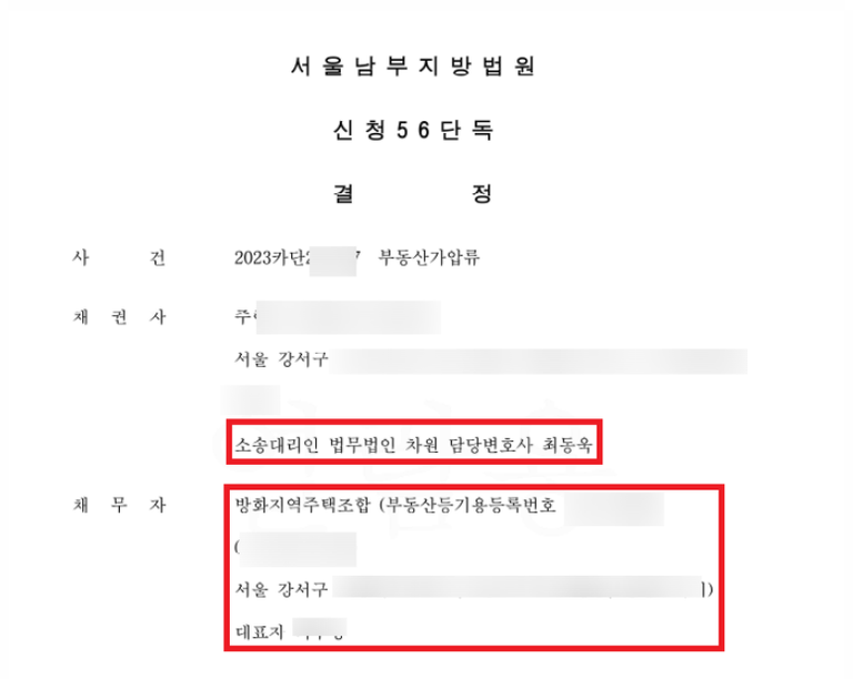 위하여 방화지역주택조합 소유 부동산에도 미리 가압류신청을 하였고 법원의 가압류결정을 받아냈습니다.