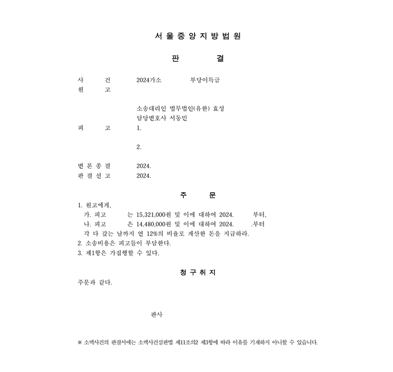 저는 즉각 입금 받은 자들을 피고로 하여 민사소송 부당이득반환청구소송을 제기하였고 법원은 원고 승소 판결을 선고하여 의뢰인은 피해액을 반환받았습니다.