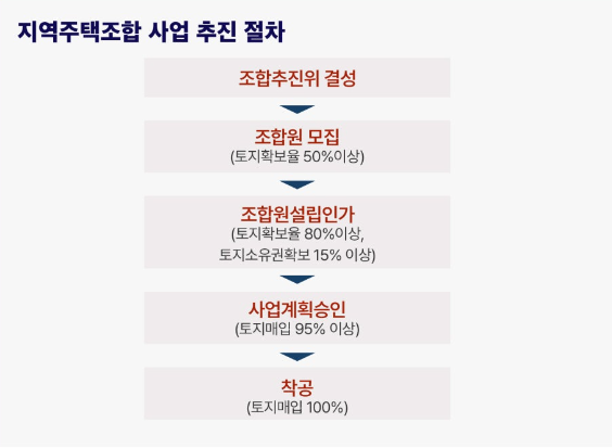 지역주택조합 사업은 법령에 따라 아래와 같이 사업의 각 단계별로 사업부지의 일정 비율을 확보하여 사업절차의 다음 단계로 진행될 수 있습니다. 화성슬항리의 홍보자료들에서 나온바와 같이 "토지계약 100% 완료"라는 것은 얼핏보면 아파트를 지을 부지가 100% 매입되어 조합설립인가, 사업계획 승인, 착공 등의 절차도 모두 완료되어 곧 입주가 실현될 것 같은 의미로 적혀있는데, 실제로는 토지를 확보하지 못하여 '조합설립인가' 조차 받지 못한 상황인 것입니다.