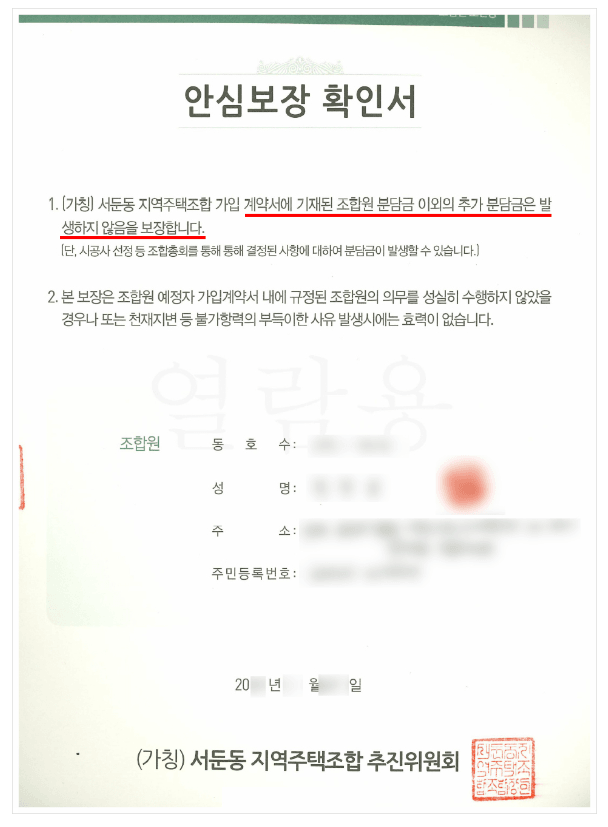 서둔동 지역주택조합은 특히 홍보를 할 당시 가입자모집 안내문에 기재된 "아파트를 건립하기 위한 토지의 약 63%를 이미 매매하였다"는 내용을 보여주면서 사업이 일정대로 빠르게 진행될 것이라 안내하였고, 계약을 체결할 경우 '계약서에 기재된 조합원 분담금 이외의 추가 분담금은 발생하지 않음을 보장합니다'라는 내용의 '안심보장 확인서 (안심보장증서)'를 줄 것이니 안심하고 계약해도 좋다고 홍보하며 조합원 가입 계약을 유도하였습니다.
