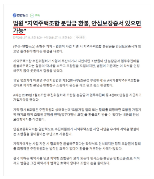 현재 법원에서는 전국 대부분의 지역주택조합에서 발행한 안심보장증서가 적법한 절차대로 만들어지지 않았기 때문에 효력이 없다고 보고, 조합이 이처럼 무효인 확약서를 이용하여 조합 가입계약을 유도한 행위가 조합원들을 속이고 기망한 것이기 때문에 계약 자체가 무효라는 판결을 일관되게 선고하고 있습니다. 따라서 만일 현재 조합측에서 교부한 안심보장증서를 갖고 계신 조합원이시면서 아직 피해금원을 돌려받지 못하셨거나 조합 가입 계약 취소나 탈퇴를 원하시는 분들이 계시면 지역주택조합 사건과 관련하여 다양한 실무경험을 갖고있는 변호사를 만나셔서 정확한 법률진단 후 탈퇴절차를 시작해 보실 것을 조언드립니다.
