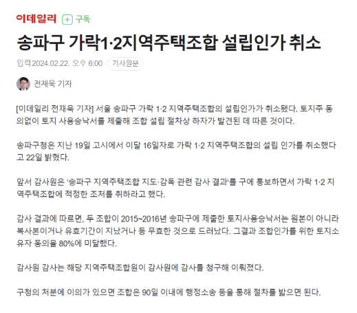 서울 강남구와 강동구 사이에 위치해 있는 송파구는 서울에서 가장 인구가 많은 지역 중에 하나이며 한강공원, 석촌호수, 롯데그룹상권 등의 인프라로 강남, 서초 다음으로 많은 사람들이 선호하는 거주지역 입니다. 이에 송파구 내에는 아파트를 짓고자 하는 지역주택조합이 총 8개가 만들어져 있는데, 안타깝게도 8개의 조합 모두 사업승인을 받지 못한 채 수년간 정체되어 있어 많은 조합원들이 최동욱 변호사에게 조합탈퇴를 위한 상담문의를 주고 계시는 실정입니다. 특히 가락 1·2 지역주택조합은 무려 2015년부터 조합원을 모집하기 시작하여 사업을 이끌어 왔지만 기존에 송파구에 제출했던 토지사용승낙서가 복사본이거나 유효기간이 지난 무효의 서류인 것으로 드러나 지난 2월에 결국 조합설립인가가 취소되어 지주택 사업의 고질적인 문제를 여과없이 드러냈습니다.