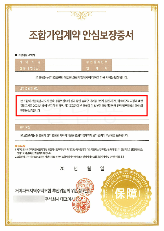 거여파크 지역주택조합은 조합원들과 계약을 체결할 당시 "지구단위계획구역 지정에 대한 결정고시를 2022년 내에 받지 못할 경우, 상기조합원이 본 조합에 기 납부한 조합원분담금 전액(업무대행비 포함)의 반환을 보장합니다."라고 기재된 안심보장증서를 교부하였습니다. 대부분의 조합원들은 위 안심보장증서로 인하여 사업이 잘못되더라도 투자원금을 보전받을 수 있을거라 생각하고 계약을 체결하였는데, 안타깝게도 거여파크 지역주택조합에서 교부한 안심보장증서는 조합총회의 결의를 거치지 아니하고 작성·교부된 것에 불과하여, 법적으로는 '무효'에 불과합니다. 특히 법무법인 차원은 이미 거여파크 지역주택조합을 상대로 민사소송을 제기하여 승소한 업무경험이 있기 때문에, 안심보장증서를 교부받은 조합원들은 기망 또는 착오를 이유로 하여 민사소송을 제기하여 조합를 탈퇴하고 납입금 전액을 반환받을 가능성이 대단히 높습니다. 법적으로 무효인 안심보장증서로 인하여 조합가입계약을 체결한 것이 조합의 기망행위에 해당하기 때문에 소송을 통해 계약 자체를 취소시키고 그에 따라 기 납부했던 납입금들을 반환받는 것입니다.
