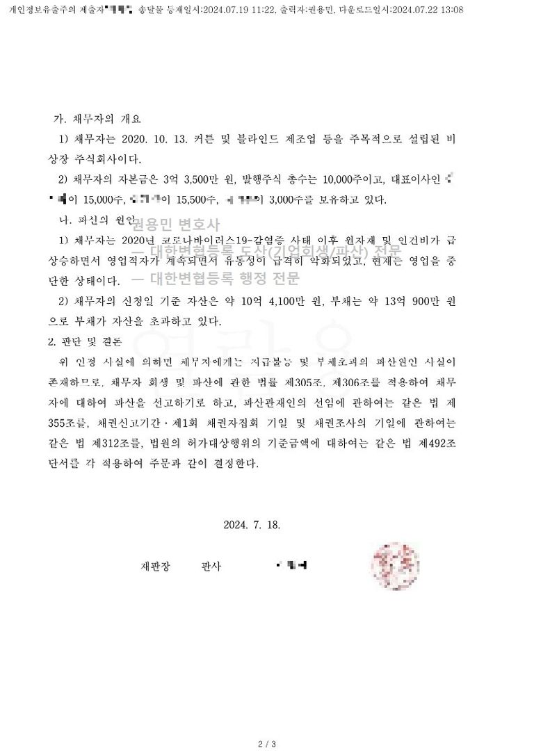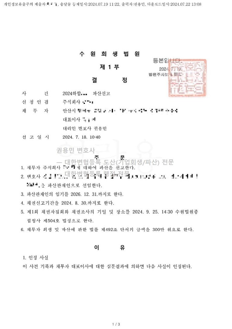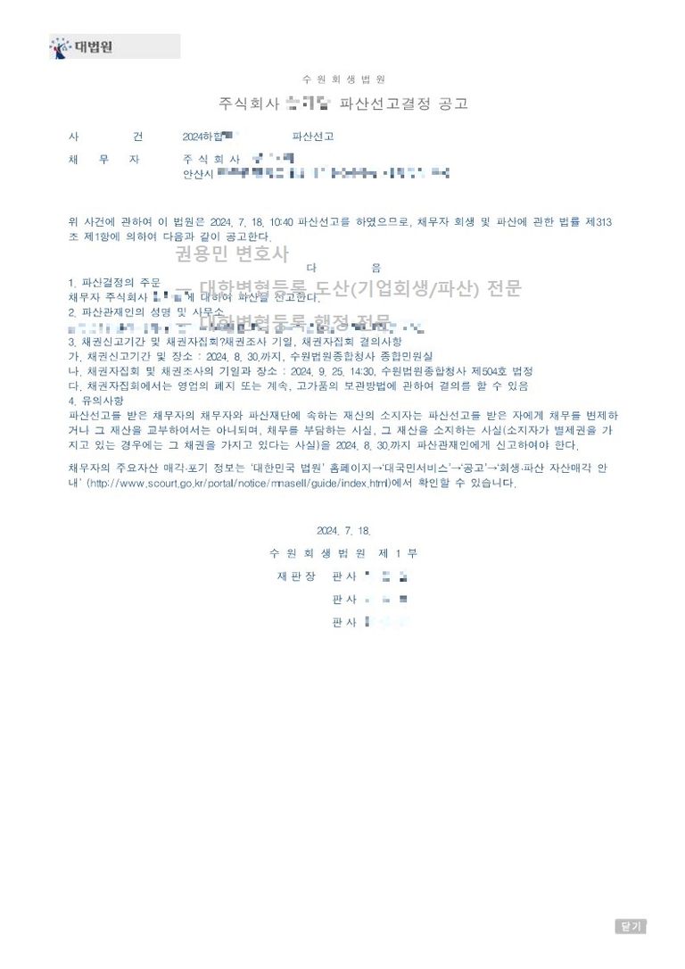 2024. 07. 18. 법인파산 선고 - 수원회생법원
