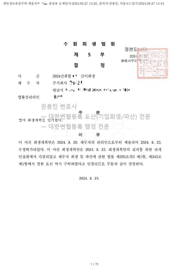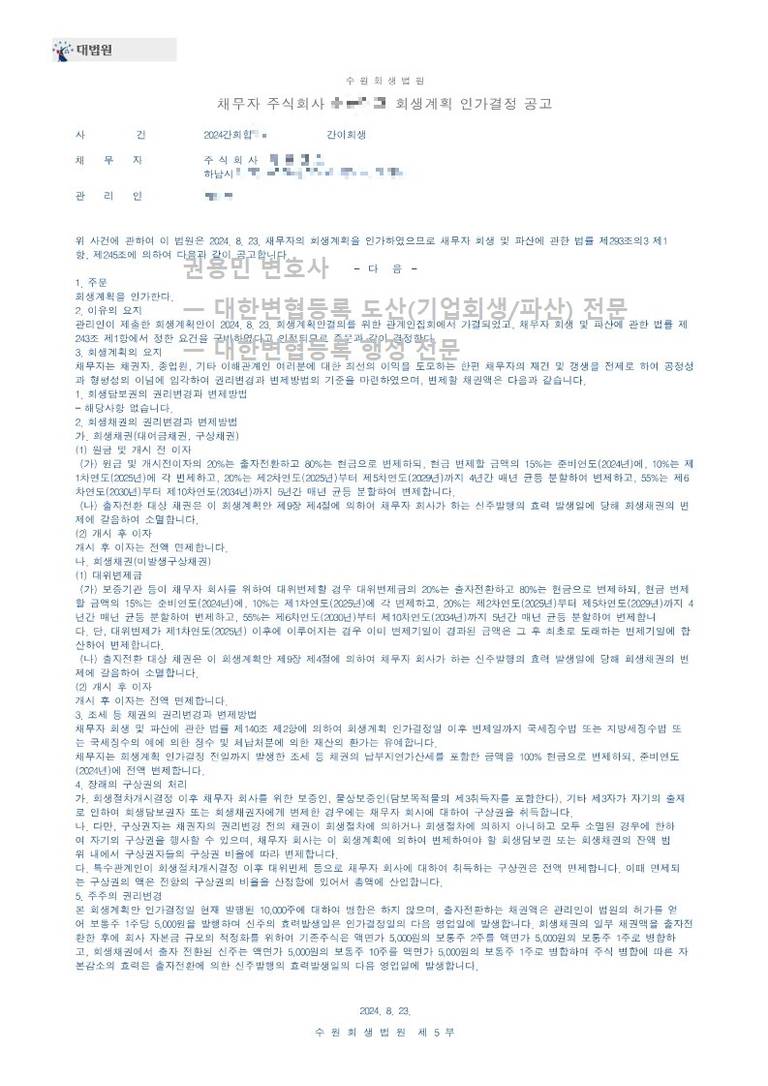 2024. 08. 23. 간이회생 인가 - 수원회생법원
