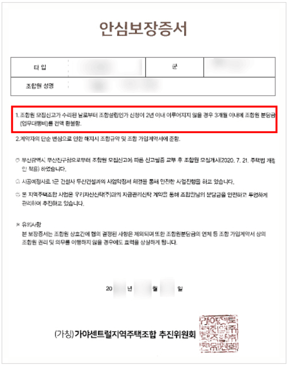 가야센트럴 지역주택조합 측은 계약 당시 조합원들에게 '조합원 모집신고가 수리된 날로부터 조합설립인가 신청이 2년 이내 이루어지지 않을 경우 3개월 이내에 조합원 분담금(업무대행비)를 전액 환불함'이라는 내용이 기재된 안심보장증서를 교부하였습니다. 최동욱 변호사와 상담을 하신 조합원분들은 모두 이러한 안심보장증서의 내용으로 투자를 결정하고 계약금과 분담금을 납부하였는데, 최동욱 변호사의 검토에 따르면 가야센트럴 지역주택조합에서 교부한 안심보장증서는 조합총회의 결의를 거치지 않고 작성·교부되었기 때문에 법적으로 '무효'에 불과합니다. 따라서 안심보장증서를 교부받으신 분들은 민사소송을 통해 이에 대한 조합측의 기망성을 주장하여 조합계약을 취소하고 납입금을 전액 환불받는 판결을 받으실 가능성이 대단히 높습니다. 이는 가야센트럴 지역주택조합 뿐만 아니라 이러한 안심보장증서를 교부한 타 지역주택조합에서도 적용되는 사항이기 때문에 만일 지역주택조합으로 인해 오랜기간 어려움을 겪고 계신다면 가지고 계신 안심보장증서와 기타 가지고 계신 조합관련 문서들을 모두 지참하셔서 지역주택조합 변호사를 통해 정확한 법률진단을 받아보시길 바랍니다.