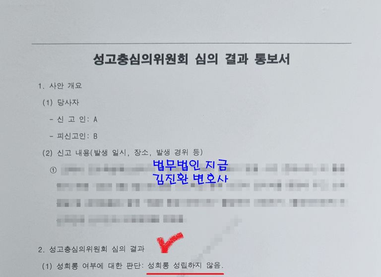 이번 성공사례는 또다시 성고충심의위원회에서 성희롱 미성립 결정을 이끌어낸 사례인데요