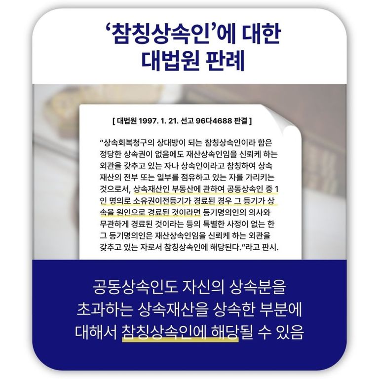 라고 판시하여(대법원 1997. 1. 21. 선고 96다4688 판결) 공동상속인도 자신의 상속분을 초과하는 상속재산을 상속한 부분에 대해서 참칭상속인에 해당한다고 보고 있습니다.