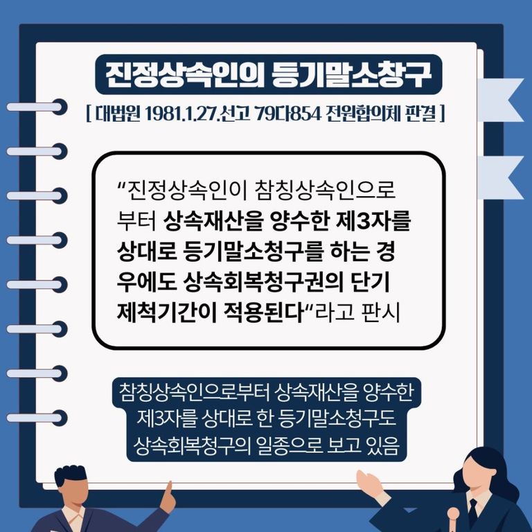 또한 대법원에서는 “진정상속인이 참칭상속인으로부터 상속재산을 양수한 제3자를 상대로 등기말소청구를 하는 경우에도 상속회복청구권의 단기의 제척기간 3년이 적용된다” 라고 판시하여(대법원 1981. 1. 27. 선고 79다854 전원합의체 판결), 참칭상속인으로부터 상속재산을 양수한 제3자를 상대로 한 등기말소청구로 상속회복청구의 일종으로 보고 있는 것입니다.