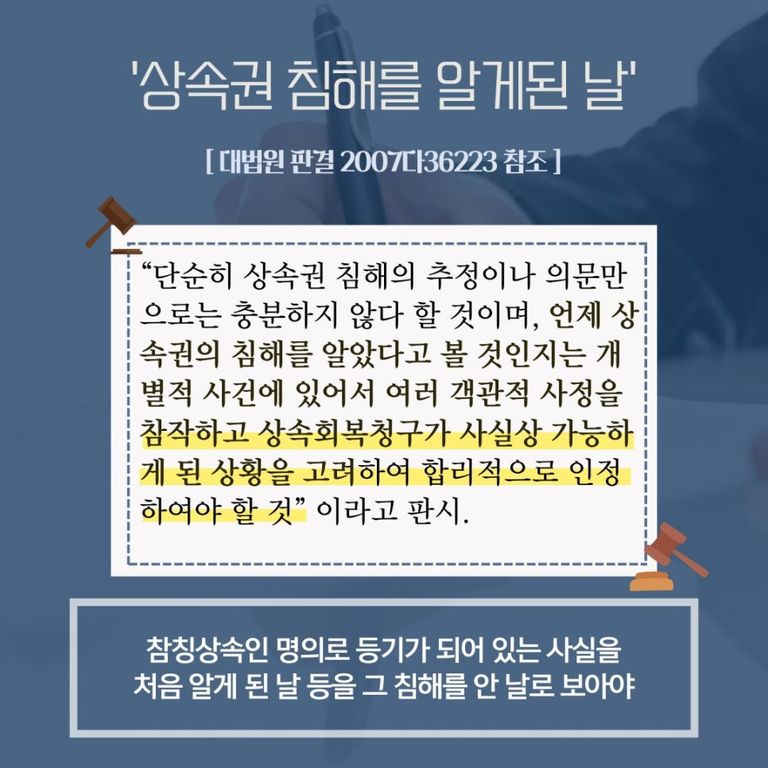 또한 위와 같은 상속회복청구권의 행사는 그 침해를 안 날로부터 3년 이내에 행사하도록 하고 있는데, 위 규정에서 “그 침해를 안 날”의 의미에 대하여, 대법원은 “단순히 상속권 침해의 추정이나 의문만으로는 충분하지 않다 할 것이며, 언제 상속권의 침해를 알았다고 볼 것인지는 개별적 사건에 있어서 여러 객관적 사정을 참작하고 상속회복청구가 사실상 가능하게 된 상황을 고려하여 합리적으로 인정하여야 할 것”이라고 판시하고 있으므로(대법원 판결 2007다36223 참조), 사실상 참칭상속인 명의로 등기가 되어 있는 사실을 처음 알게 된 날 등이 그 침해를 안 날이라고 보아야 합니다.
