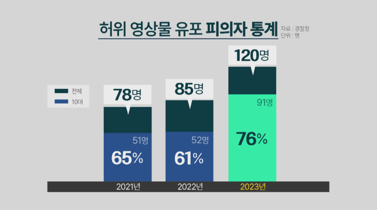 2021∼2023년 경찰에 신고된 허위영상물(딥페이크 범죄를 통해 편집된 합성음란물) 사건의 피해자 총 527명 중 59.8%(315명)는 10대였다고 합니다.