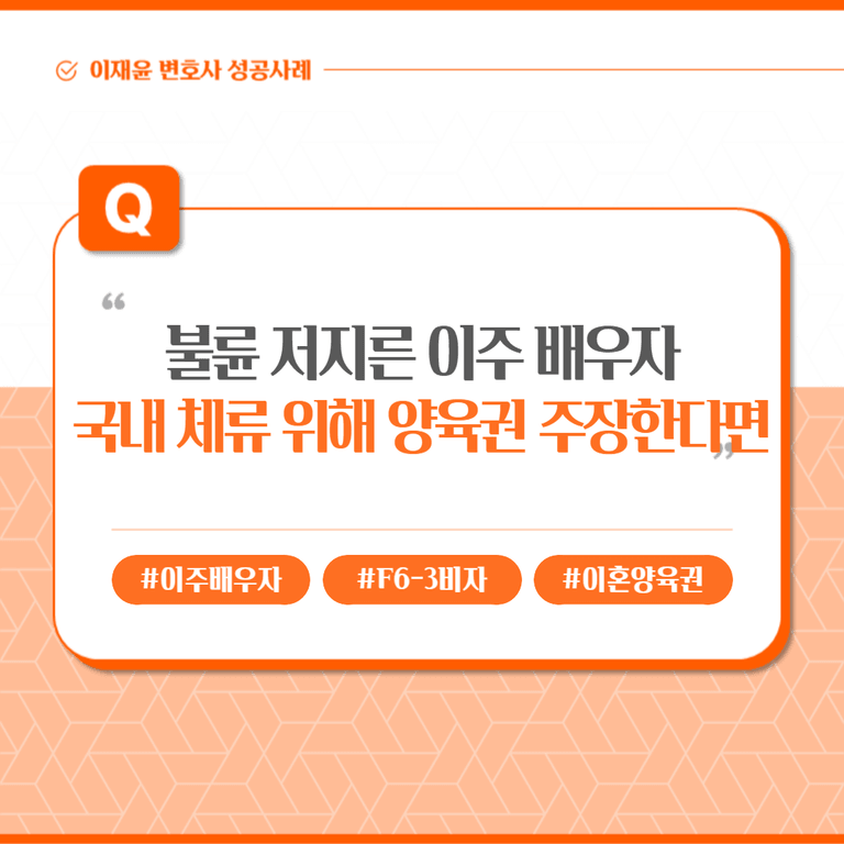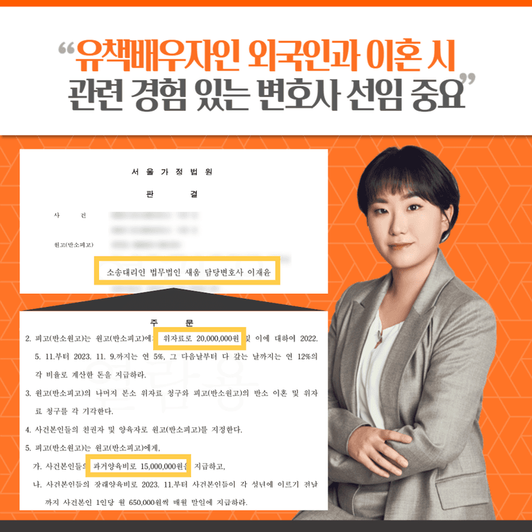 외국인 배우자의 귀책사유로 인하여 이혼을 하게 되는 경우 비자 문제가 이혼 사건에도 영향을 미치는 만큼, 관련 사안을 충분히 경험하여 본 변호사를 선정하는 것이 중요합니다.