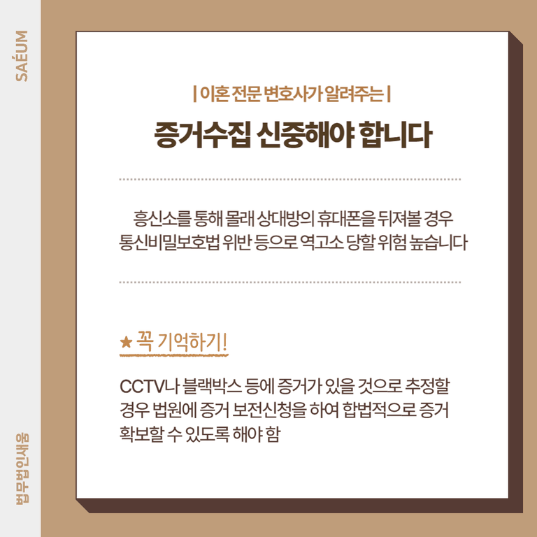 상간소송 위자료 청구를 하기 위해서 자료를 확보해야 한다는 조급함으로 무작정 흥신소를 찾아가거나 몰래 차량을 뒤져보고 휴대전화 기록을 복구하거나 잠겨있는 상태의 휴대폰을 상대방 몰래 잠금을 해제하여 결정적인 증거를 확보하려고 무리를 하는 분들이 있습니다. 하지만 이와 같은 방법으로 확보하는 경우 이후에 상대방에게 통신비밀보호법 위반 등으로 고소를 당하게 될 수 있습니다. 아무리 부부라고 하여도 이와 같은 행동은 불법이기 때문에 처벌의 대상이 되기 때문입니다. 따라서 합법적으로 물증을 확보할 수 있도록 해야 하는데요. CCTV나 블랙박스 등에 증거가 남겨져 있을 것으로 추정되는 경우 억지로 확보할 것이 아니라 법원에 증거 보전신청을 하여서 소유자의 협조를 얻어 필요한 자료를 확보할 수 있도록 해야 합니다.