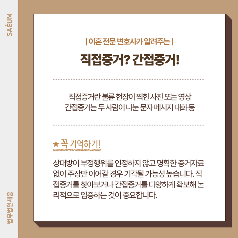 직접증거는 말 그대로 문제 상황에 대해서 직접적으로 증명할 수 있는 증거를 말합니다. 예를 들면 성관계 장면이 나온 동영상 등은 직접증거라고 할 수 있는데요. 간접증거는 문제 상황을 추정하여 간접적으로 증명할 수 있는 증거를 말합니다. 예를 들어 두 사람이 문자 메시지를 주고받으면서 애정을 표현하는 등의 대화를 나눴고 이를 확보했다면 간접증거를 활용할 수 있습니다.
