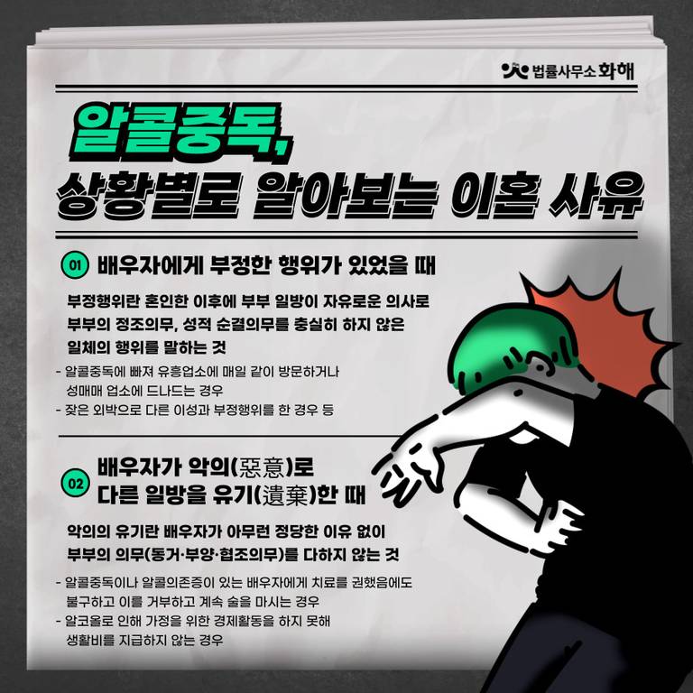 오늘은 법률사무소 화해에서 술이 술을 마신다는 알콜중독이혼에 대해 알려드릴게요.