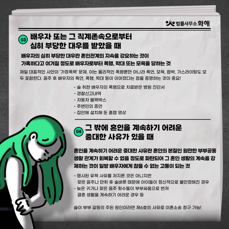 * 잠깐! 혹시 배우자의 알콜중독으로 다급한 상황이거나, 하루하루 어떤 일이 벌어질지 모를 두려운 상황에 놓여 있으신가요? 그렇다면 지금 즉시 법률사무소 화해에 도움을 요청해 주시길 바랍니다.