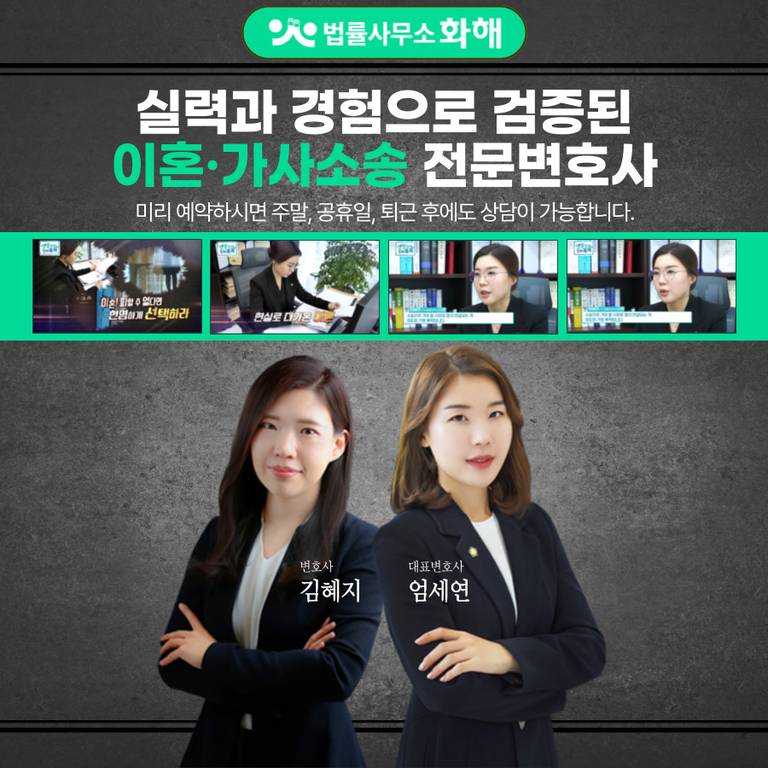 알콜중독이혼을 결심하셨다면 지금부터라도, 차근차근 증거자료를 모아보세요. 어떻게 입증하냐에 따라 위자료는 달라질 수 있으며, 특히 재산분할 문제는 유책 사유가 아닌 기여도에 따라 나누는 것이기 때문에, 위자료뿐만 아니라 정당한 자신의 몫을 확보하고 고통 속에서 하루빨리 벗어날 수 있도록, 법률사무소 화해의 이혼 ·가사 전문변호사가 의뢰인의 새로운 시작을 도와드리겠습니다.