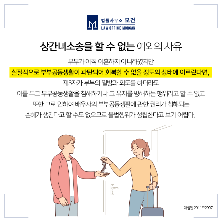 한편 더이상 부부관계가 회복될 수 없을 정도로 파탄이 된 상태에서의 제3자와의 교제라면 그것이 부부의 혼인관계파탄과 인과관계가 없다고 보아, 외도 배우자에 대한 책임이나 상간자에 대한 위자료 책임이 받아들여지지 않을 수 있습니다. 이는 많은 외도 당사자나 상간자들의 변명이 되기도 하므로 이에 대한 판단은 상간녀소송전문변호사의 개별적인 자문을 받아보셔야 합니다.