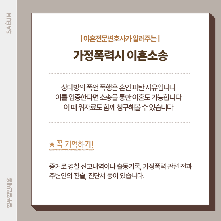 이렇게 가정폭력 이혼에 대해서 알아보았습니다. 사안이 사안인 만큼 숙려기간 단축이 가능하며 명확한 이혼사유로 활용하여 도움을 받는 것이 가능합니다. 심지어 형사고소를 통해서 상대방이 휘두른 가정폭력에 대한 법적인 처벌을 받도록 대응하는 것도 가능하므로 현재 처한 상황과 본인이 바라는 대응 방향에 따라서 다방면으로 대처해 볼 수 있습니다. 그러니 혹시라도 부당한 폭력을 당하고 있는 상황에서 어떻게 대처해야 할지 모르겠다면, 변호사를 찾아가 신속한 신변 보호는 물론 이혼 진행까지 전 과정에 대한 도움을 받아보시기를 바랍니다.